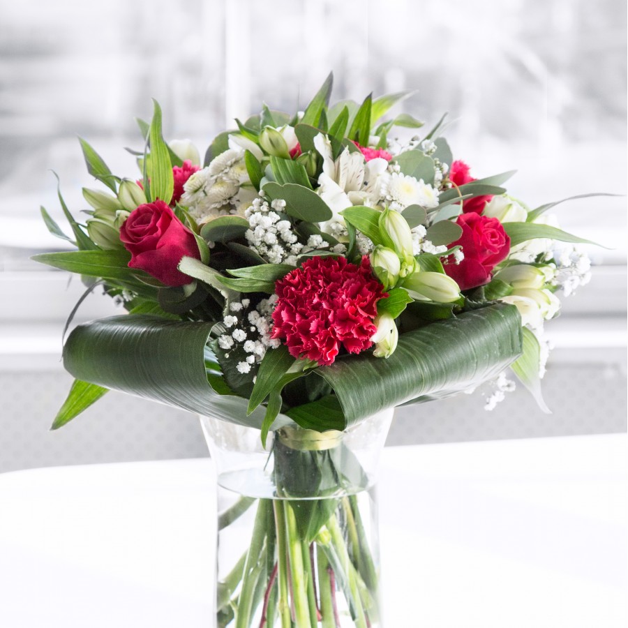 Our breathtaking bouquet is designed to inspire and delight. Featuring luxurious red roses paired with pure white chrysanthemums, delicate gypsophila, and elegant carnations. The arrangement is beautifully complemented by white alstroemeria and aspidistra leaves, creating a harmonious and visually appealing display.