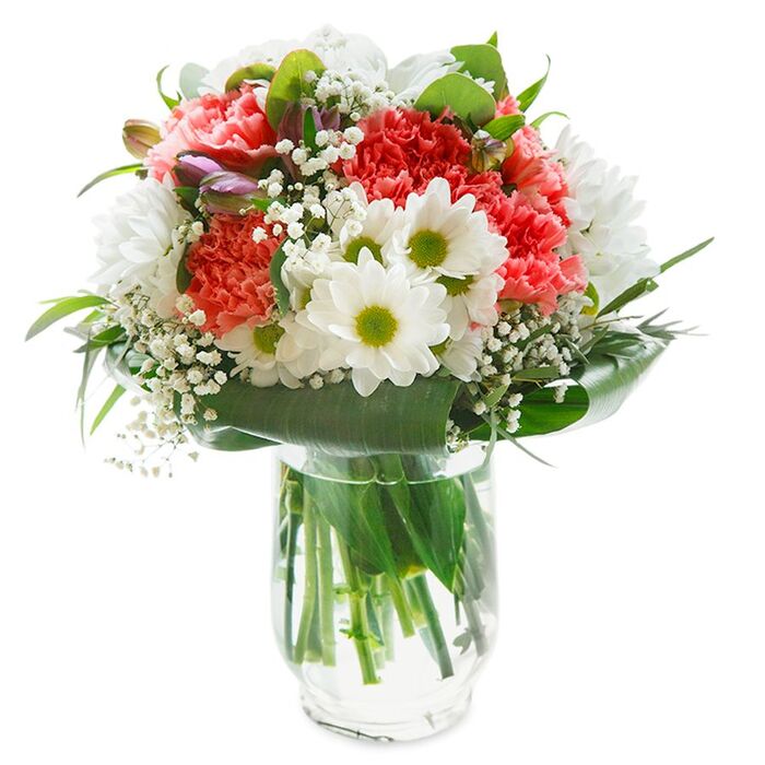 Brighten someone’s day with our beautiful flower arrangement, a perfect expression of love and appreciation. This delightful bouquet combines snow-white chrysanthemums, airy gypsophila, gentle light pink carnations, and rich aspidistra leaves for a harmonious and eye-catching display.